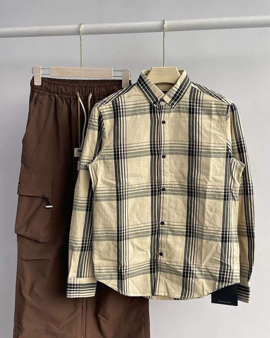 The shirt is a long-sleeve, button-down plaid shirt in a cream base with black and gray checkered stripes. It features a classic collar, front button closure, and appears to be made from a lightweight cotton or cotton-blend material. The shirt has a regular fit and includes a small brand tag on the hem.