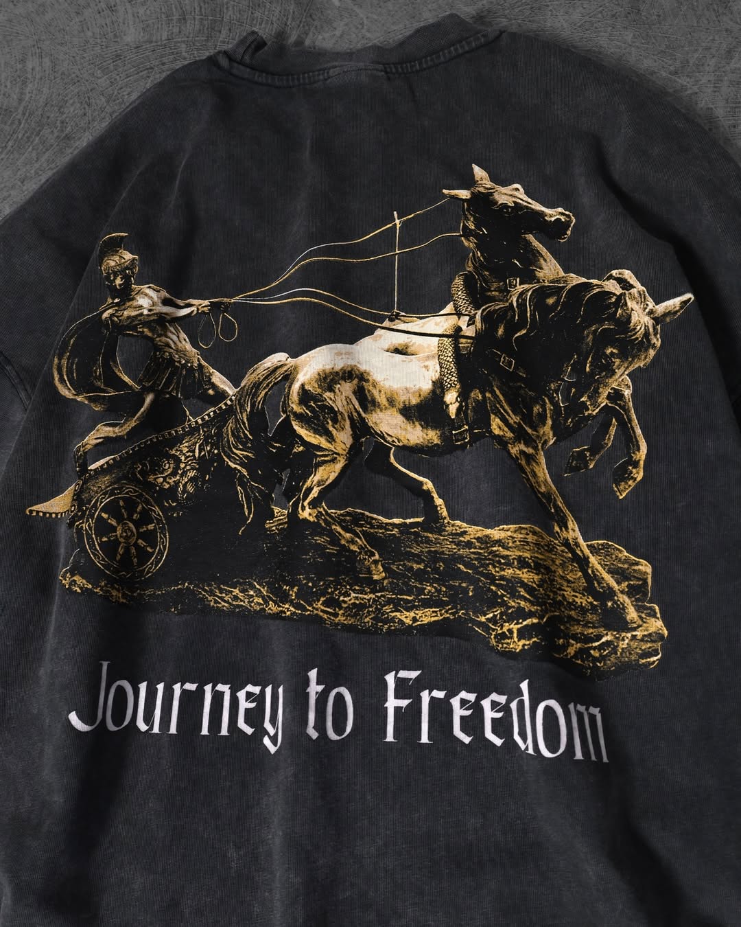This black, vintage‑washed oversized tee features a striking gold‑toned graphic on the front depicting a cowboy driving a pair of rearing horses hitched to a wagon wheel, set on rocky terrain. Below the illustration, the phrase *“Journey to Freedom”* is printed in white gothic‑style lettering. The shirt has short sleeves and a small white tag near the hem.